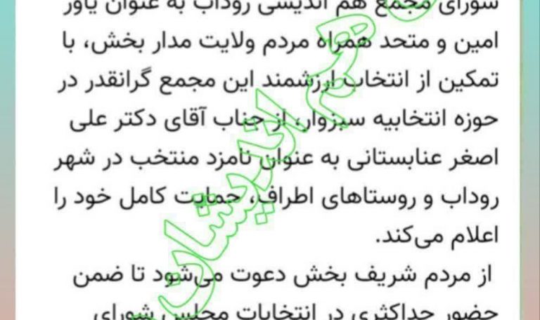 به نام ایزد یکتا بیانیه مجمع هم اندیشان روداب در آستانه برگزاری دوازدهمین دوره انتخابات مجلس شورای اسلامی و ثمرات ارزشمند آن در تعالی جمهوری اسلامی به استحضار می رساند شورای مجمع هم اندیشی روداب به عنوان یاور امین و متحد همراه مردم ولایت مدار بخش، با تمکین از انتخاب ارزشمند این مجمع گرانقدر در حوزه انتخابیه سبزوار، از جناب آقای دکتر علی اصغر عنابستانی به عنوان نامزد منتخب در شهر روداب و روستاهای اطراف، حمایت کامل خود را اعلام می کند.